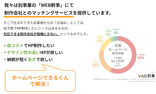 その中で、課題になったのが「低予算のホームページ」。中小企業は予算が限られている中で、可能な限り安くホームページを作りたい。一方でホームページを作る制作会社は、一定以上の予算が見込めないと、案件の対応が難しくなる。低価格帯のホームページ制作は、明確に需要と供給のバランスが不一致な課題がありました。